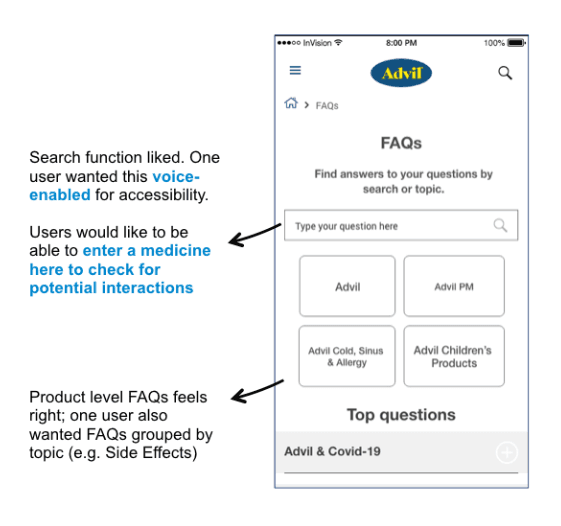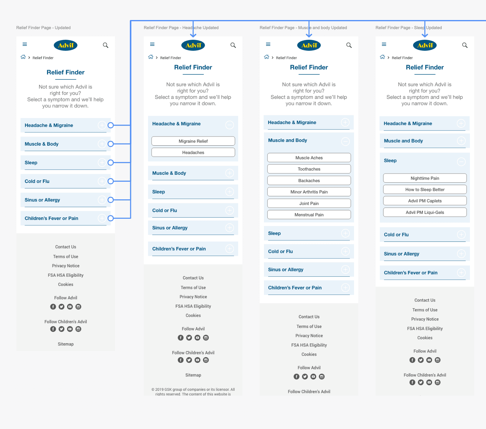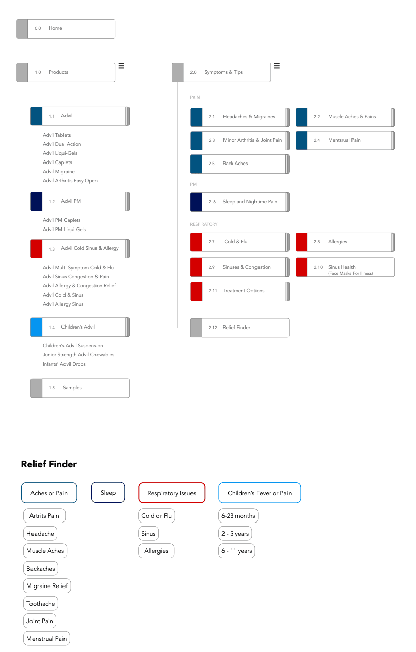 Based on the testing results, we adjusted the UX and moved forward using the Advil brand guidelines and the AXURE infrastrucute to build the final UI, targeting the AA WCAG compliant for accesibility, and usability and best practices.