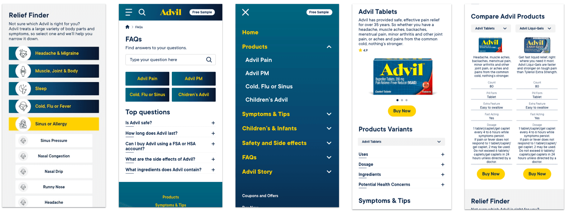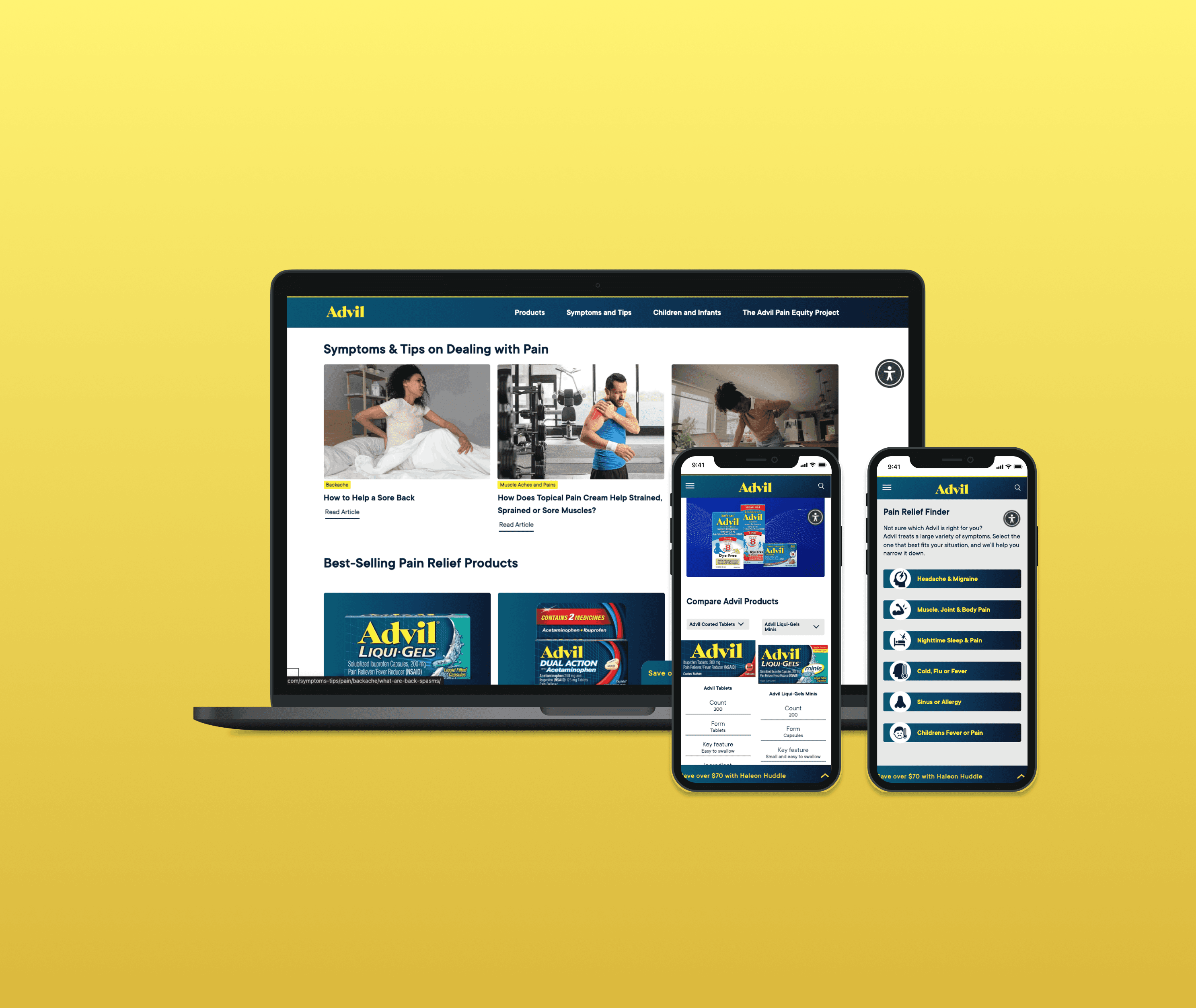 Advil needed to catch up with their competitors: Tylenol and Bayer. More than 80% of website traffic comes from mobile users (particularly from in-store), that wasn't having a great experience with their previous websites. I mentioned websites, because they had 4 different of them, one for each type of products, and they need to centralize all information in one place.